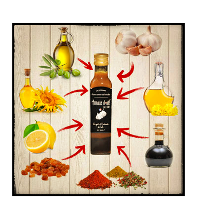 Amour d’ail, c’est un goût à la fois puissant et doux. Une seule recette et des utilisations multiples…Cette délicieuse vinaigrette vous permettra de colorer et de sublimer toutes vos salades, tapenades et marinades pour l’été, en famille, avec vos amis.